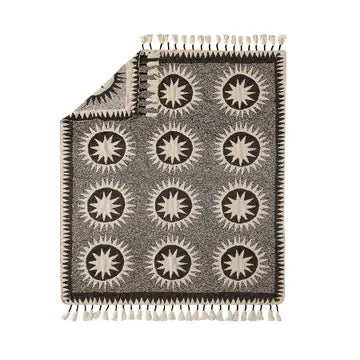 Inspired by the rich heritage of traditional Central Asian textiles, the Soleil throw reimagines the classic suzani quilt through Justina’s modern, boho-luxe lens. In traditional suzani craftsmanship, sun medallions and symbolic motifs are embroidered to represent protection, abundance, and the radiant energy of life. The Soleil honors this legacy with its own contemporary spin—sunbursts designed to uplift your space, paired with black cosmic dots that echo the infinite nature of the cosmos. Set against a soft cream background and finished with rows of playful tassels, this 50" x 60" throw adds both warmth and artistry to any room.